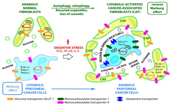 Reverse Warburg Effect. Normal fibroblasts/mesothelial cells are transformed into glycolytic cancer-associated fibroblasts (CAFs) under the influence of hypoxic cancer cells. In the process, fibroblasts lose their mitochondrial function via cytokines, oxidative stress, and mitophagy and come to rely on cytoplasmic glycolysis. CAFs release energy substrates (pyruvate, lactate, ketone bodies, glutamine) into the tumor microenvironment (TME) via autophagy and MCT4. These are taken up by MCT1 and glutamine transporters in anabolic cancer cells to maintain OXPHOS and mitochondrial ATP production (adapted from [33,34]).