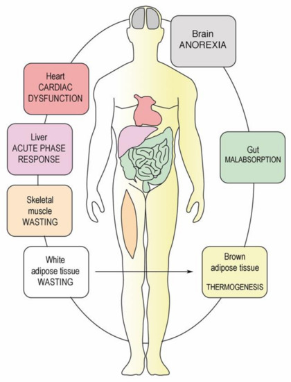 CAS is a multiorgan syndrome. Peritoneal metastasis induces a systemic inflammatory response triggered by hormonal and inflammatory mediators [59]. Changes caused by PM involve not only the intestines, but also brown and white adipose tissue, muscle, brain, liver, and heart. Thus, CAS in PM patients should be considered as a multi-organ, and not an abdominal syndrome (adapted from [12]).