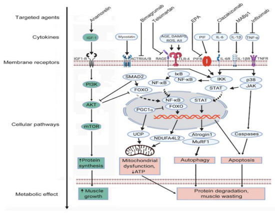 - Argiles, J.M.; Busquets, S.; Stemmler, B.; Lopez-Soriano, F.J. Cachexia and sarcopenia: Mechanisms and potential targets for intervention. Curr. Opin. Pharmacol. 2015, 22, 100–106. [Google Scholar] [CrossRef]