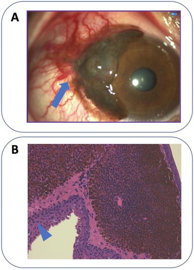 Clinical and histological appearance of melanoma of the bulbar conjunctiva. (A) A pigmented elevated, vascularized lesion (arrow) with feeder vessels located in the temporal bulbar conjunctiva and in the limbus. It originated in the conjunctival epithelium and gradually grew over the cornea. (B) Histological appearance of the lesion in (A). Dense cohesive sheets of rounded cells with varying pigmentation can be seen in the stroma, constituting a conjunctival melanoma. The overlying epithelium has normal appearance (arrowhead). Original magnification 200×—courtesy of Vincenzo Fiorentino, Pathology Department, Fondazione Policlinico Universitario Agostino Gemelli IRCCS).