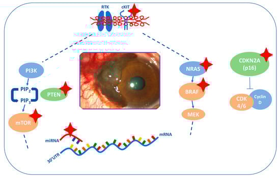 Main mechanisms involved in conjunctival melanoma (CjM). The most relevant alterations are indicated with red stars. BRAF and NRAS mutations are mutually exclusive. cKIT mutations are mutually exclusive with BRAF/NRAS mutations.