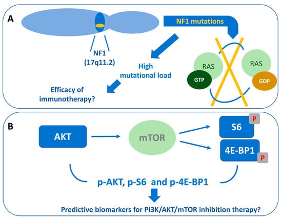 Potential molecular predictive factors for immunotherapy or target therapy in conjunctival melanoma. (A) NF1 (17q11.2) mutations, which cause the loss of RAS-bound GTP hydrolysis, are associated with high mutational load and could help to predict the efficacy of immunotherapy; (B) High levels of AKT, phosphorylated S6 and 4E-BP1 are related to mTOR mutation and could predict the efficacy of PI3K/AKT/mTOR inhibition therapy.
