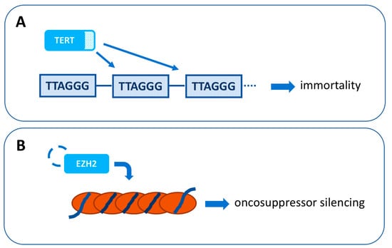 New potential therapeutic targets for conjunctival melanoma. (A) Telomerase reverse transcriptase (TERT) is a catalytic subunit of the telomerase enzyme that catalyzes the addition of repetitive sequences in the terminal TTAGGG of chromosomes. TERT promoter mutations, which cause an increased TERT expression, are detectable in 32–41% of conjunctival melanomas. (B) Enhancer of zeste homolog 2 (EZH2) is a histone methyltransferase which catalyses trimethylation of lysine 27 in histone H3 (H3K27me3), leading to transcriptional silencing of oncosuppressors. EZH2 is highly expressed in 50% of primary conjunctival melanomas and 88% of lymph node metastases.