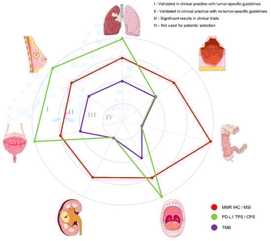 Schematic representation of the main tools available for patients’ selection for immunotherapy, according to the different anatomical sites. Clockwise from the top: non-small cell lung cancer, cutaneous melanoma, colorectal cancer, head and neck squamous cell carcinoma, renal cell carcinoma, urothelial carcinoma, and breast cancer. Each circle represents a level of validation of the various tools, as reported on the top right. The diagnostic tests are color-coded on the basis of the legend on the bottom right. MMR, mismatch repair; IHC, immunohistochemistry; MSI, microsatellite instability; PD-L1, programmed cell death ligand 1; TPS, tumor proportion score; CPS, combined positive score; TMB, tumor mutational burden.