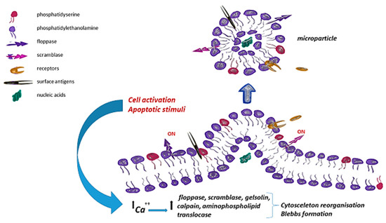 The primary settings for MPs release are cellular activation and death. An increase in the intracellular concentration of calcium ions secreted by cytoplasmic reticulum is a response to multiple factors, including: An increase in the number of free radicals, increased shear force, adenosine diphosphate (ADP) secreted by activated platelets, expression of CD40 ligand (CD40L) on T-cells [26]. In these conditions, activation of calcium concentration-dependent enzymes takes place; these include gelsolin, which facilitates the separation of actin fibers from platelet cytoskeleton [27]; aminophospholipid translocase, which transports aminophospholipids from the outer membrane into the cell interior [28]; floppase, which transports phospholipids from the inner lipid bilayer outwards [29]; calpain, which destroys cytoskeleton actin fibers [30]; and scramblase, which affects transmembrane phospholipid transport [31] (Figure 1). The activated enzymes contribute to the loss of asymmetric distribution of phospholipids in the cell membrane in which phosphatidylserine (PS) and phosphatidylethanolamine (PE) are present mainly in the inner cytoplasmic layer, and phosphatidylcholine (PC) and sphingomyelin (SM) are present in the outer layer of the lipid bilayer. The asymmetry loss process resulting from transferring phosphatidylserine and phosphatidylethanolamine to the outer layer of the cell membrane and simultaneous cytoskeleton destabilization allow the formation and secretion of microparticles [26,32].