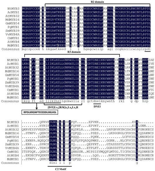 Multiple alignments of the protein sequences of NtMYB3 with other R2R3-MYB repressors belonging to subgroup 4. Blue shaded are indicated the 100 % homology suquences of amino acids.