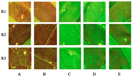 Transient transformation of tobacco leaves (Nicotiana tabacum). R1, R2, and R3 represent three replicates. (A) Infiltration with StMYB-AN1; (B) Co-infiltration of pSAK277 with StMYB-AN1; (C) Infiltration with NtMYB3; (D) Co-infiltration of StMYB-AN1with NtMYB3; (E) Co-infiltration of StMYB-AN1, NtMYB3, and StbHLH. Photos were taken after five days of agro-infiltration injection. (Scale bar = 1 cm).