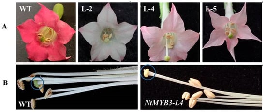 Floral phenotypes of transgenic tobacco plants carrying NtMYB3 gene.Wild type tobacco (WT) and transgenic lines of tobacco are (L-2, L-4 and L-5). Flower color comparison in wild type (WT) and transgenic lines (A); Comparison of pistil length in WT and transgenic tobacco (B). Blue circle indicated the top of the pistal length.