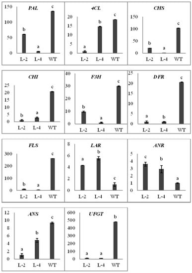Expression analyses of flavonoid biosynthetic pathway key genes in transgenic flowers carrying NtMYB3 by qPCR. L-2, L-4, indicated two transgenic tobacco lines. PAL, Phenylalanine ammonia lyase; 4CL, 4-coumaroyl-CoA ligase, CHS, Chalcone synthase; CHI, Chalcone isomerase; F3H, Flavanone 3-hydroxylase; DFR, Dihydroflavonol 4-reductase; FLS, flavonol synthase LAR, leucoanthocyanidin reductase; ANR, anthocyanidin reductase; ANS, anthocyanin synthase; UFGT, UDP glucose-flavonoid 3-O glucosyltransferase. Small letter showed the significant difference from wild type at the level of p < 0.05 by using LSD test. The bar represents the standard error of thrice biological replications.