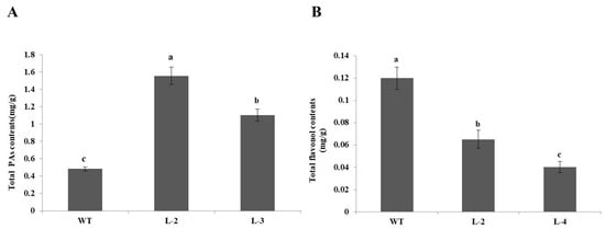 Quantification of proanthocyanin and flavonol in transgenic and wild type tobacco flowers. (A) PA contents and (B) flavonol contents. Small letters showed a significant difference at the level of p < 0.05 by using LSD statistical analysis.
