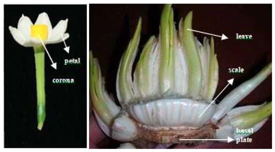 - Wu, J.; Chen, L.; Gu, L.; Wang, Y.; Tian, H. Embryological studies on narcissus tazetta var. chinensis. J. Xiamen Univ. Nat. Sci. 2004, 44, 112–115. [Google Scholar]