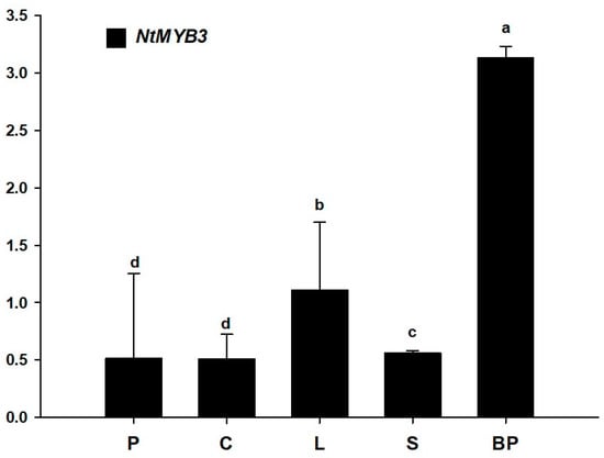 Expression analysis of NtMYB3 in various tissues of Narcissus tazetta. P, C, L, S, and BP indicate the petals, corona, leaves, bulb scales, and basal plates, respectively. Small letters showed the significant difference among different tissues at the level of p < 0.05 by using LSD test. Bars showed the standard error of three replicates.