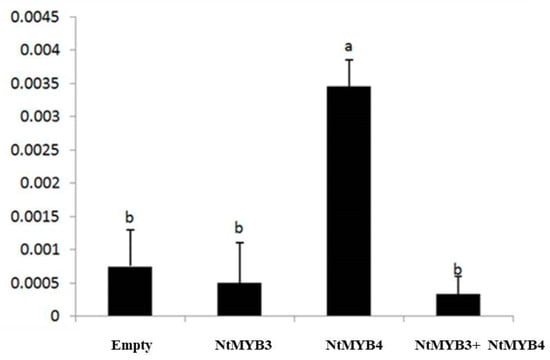 To check the function of NtMYB3, transient assays were performed in tobacco. Noticeable red pigmentation was found 3–4 days after infiltration with StMYB-AN1, which is a potato anthocyanin activator []. No anthocyanin accumulation or red pigmentation was found with infiltration of NtMYB3. Red pigmentation or anthocyanin accumulation significantly decreased in leaves of tobacco when co-infiltrated with NtMYB3 and StMYB-AN1. Furthermore, anthocyanin accumulation was also significantly reduced in leaves co-infiltrated with NtMYB3, StMYB-AN1, and StbHLH (Figure 3).