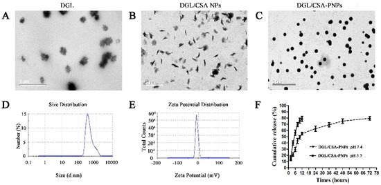 Nanoparticle characterization showing the particle size of diameter and morphology. (A–C) TEM images of DGL, DGL/CSA NPs, and DGL/CSA-PNPs; (D,E) the distribution of particle size of diameter and zeta potential of DGL/CSA-PNPs; (F) drug-release profiles of DGL/CSA-PNPs.