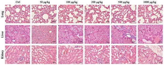 A total of thirty female CD-1 mice were randomly divided into six groups and treated as follows: Group 1 mice were injected with 0.9% saline, group 2–6 mice (n = 5 each group) were injected with 50, 100, 200, 500, and 1000 μg/kg of DGLs, every two days, for 30 days, through tail vein, respectively. Two days after the last injection, the mice were anesthetized, and then the lungs, kidney, and liver were collected from each, for histology examination.