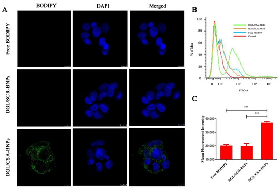 Cellar uptake of the DGL/CSA BNPs, DGL/SCR BNPs, and free DODIPY was examined by (A) confocal and (B,C) flow cytometry. Scale bar = 10 μm. ***P < 0.001 compared with the free DODIPY and DGL/SCR-NPs. The data were analyzed by using one-way ANOVA and presented as mean ± standard deviation (n = 3).