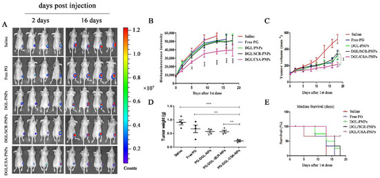 IVIS analysis of JEG3 tomato tumor growth in mice. DGL/CSA-PNPs achieved potent tumor growth inhibition. (A) tumor sizes in orthotopic tumor-bearing mice were significantly reduced as a result of treatment with DGL/CSA-PNPs as compared to other groups; (B) the curve of bioluminescence intensity after DGL/CSA-PNPs, DGL/SCR-PNPs, DGL-PNPs, and saline treatment; (C,D) quantification of tumor weight and volume over 18 days; (E) survival curve of tumor-bearing mice after being treated with DGL/CSA-PNPs, DGL/SCR-PNPs, DGL-PNPs, and saline. The data were analyzed by using one-way ANOVA and presented as mean ± standard deviation (n = 4). The “**” and “***” indicate statistically significant differences at P < 0.01 and P < 0.001, respectively.