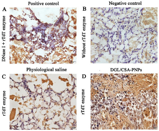 Apoptosis induced by the DGL/CSA-PNPs by Tunnel analysis. (A) positive control; (B) negative control; (C) physiological saline; (D) DGL/CSA-PNPs treatment in JEG3 tumor tissues. Scale bar = 20 μm.