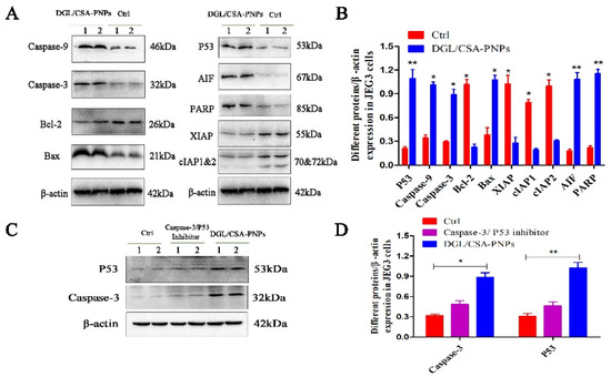Western blot assay of DGL/CSA-PNPs-induced apoptosis. (A,B) extracts of JEG3 cells and (C,D) caspase-3/P53-inhibitor-treated JEG3 cells were used for anticancer mechanism analysis by Western blotting. Levels of caspase-9, caspase-3, bcl-2, bax, P53, AIF, PARP, XIAP, cIAP1 and cIAP2, and β-actin in vitro that was treated with specially designated concentrations of DGL/CSA-PNPs (50 μg/mL) for 48 h in JEG3-treated and caspase-3/P53-inhibitor-treated JEG3 cells in vitro. β-actin was used as an internal control. *P < 0.05 and **P < 0.01 compared to untreated controls. The data were analyzed by using one-way ANOVA and presented as mean ± standard deviation (n = 2).