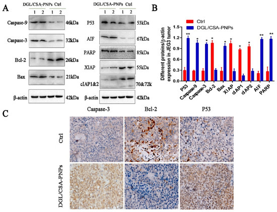 Western blot and immunocytochemistry analysis of DGL/CSA-PNPs induced apoptosis. (A,B) extracts of JEG3 tumor from DGL/CSA-PNPs-administrated mice were used for anticancer mechanism analysis by Western blotting; (C) JEG3-tumor slices collected from DGL/CSA-PNPs-administrated mice were used for immunocytochemistry analysis of caspase-3, bcl-2, and P53 in vivo. Scale bar = 20 μm. *P < 0.05 and **P < 0.01 compared to untreated controls. The data were analyzed by using one-way ANOVA and presented as mean ± standard deviation (n = 2).