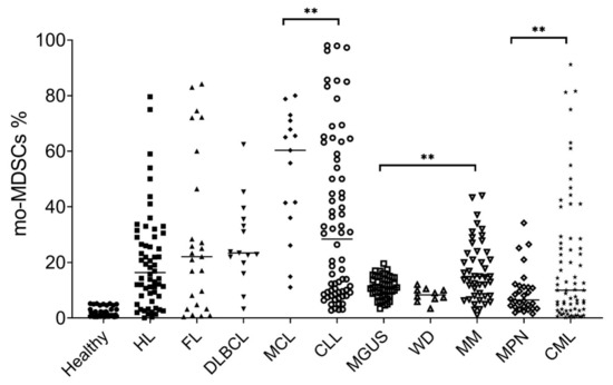 Comparison of peripheral circulating monocytic myeloid derived suppressor cells (mo-MDSCs) proportions in normal controls and patients affected by hematological malignancies (** p < 0.001, as indicated; description in the main text).
