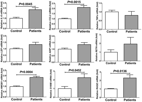 Obesity increases PE/HDP risk. Maternal obesity, increased insulin resistance, and inflammation are involved in the pathogenesis of PE/HDP [24,25]. Furthermore, PE/HDP risk has been reported to increase 2–4-fold among women with diabetes [26]. We therefore hypothesized that the PE/HDP patient sera contain some of these factors that induce insulin resistance and/or inflammation. We incubated primary cultured human adipocytes with sera from disease-free pregnant women (control) or those from PE/HDP (patients) for 24 h, and the gene expression of IL-6, CCL2, tumor necrosis factor α (TNFα), leptin (LEP), adiponectin (ADIP), resistin (RETN), HMGB1, S100B, and RAGE in the adipocytes was measured via real-time reverse transcriptase-polymerase chain reaction (RT-PCR). As shown in Figure 1, mRNA levels of IL-6, CCL2, HMGB1, S100B, and RAGE, but not TNFα, LEP, ADIP, and RETN (P = 0.4496, P = 0.1157, P = 0.0875, and P = 0.2912, respectively) were significantly increased by the addition of PE/HDP patient sera compared to those cells incubated with control sera.