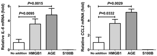Cells were stimulated with HMGB1 (1 µg/mL), AGE (150 and 300 µg/mL), S100B (100 ng/mL), and LPS (10 ng/mL) for 24 h, culture medium was collected, and the concentrations of IL-6 and CCL2 were measured by using a Human IL-6 ELISA kit (RayBiotech, Norcross, GA, USA) for IL-6 and a Quantikine® ELISA Human CCL2/MCP-1 Immunoassay kit (R&D Systems, Inc., Minneapolis, MN, USA) for CCL2, according to the instructions of suppliers.