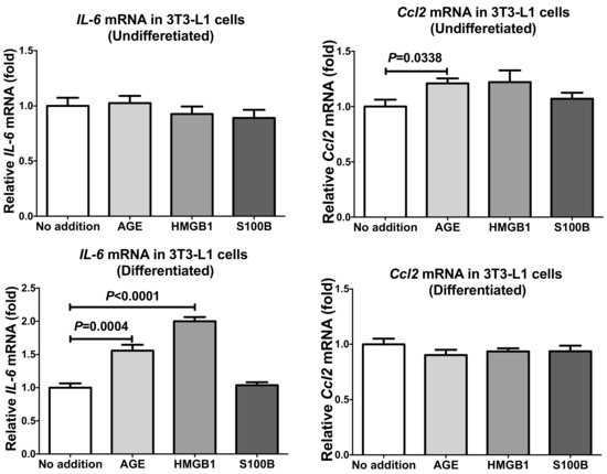 In order to see whether the up-regulation of mRNAs for IL-6 and Ccl2 occurred only in SW872 or other adipocytes, we cultured mouse 3T3-L1 preadipocytes, differentiated them into differentiated adipocytes, and tested whether ligands for RAGE up-regulate gene expression of IL-6 and Ccl2 in mouse 3T3-L1 undifferentiated preadipocytes and differentiated adipocytes. As shown in Figure 3, the mRNA levels of IL-6 were significantly up-regulated by AGE and HMGB1 but not by S100B (P = 0.6414) in differentiated 3T3-L1 adipocytes, but unchanged by any of the RAGE ligands (AGE, HMGB1, or S100B) in undifferentiated preadipocytes (P = 0.8037 [No addition vs. AGE], P = 0.4793 [No addition vs. HMGB1], and P = 0.3138 [No addition vs. S100B]). In contrast, the mRNA levels of Ccl2 remained unchanged in response to AGE, HMGB1, or S100B in 3T3-L1 differentiated adipocytes (P = 0.1892 [No addition vs. AGE], P = 0.2885 [No addition vs. HMGB1], and P = 0.4024 [No addition vs. S100B]), but significantly up-regulated in the undifferentiated preadipocytes by the addition of AGE but not by HMGB1 and S100B (P = 0.1241 [No addition vs. HMGB1] and P = 0.4305 [No addition vs. S100B]) (Figure 3). Previous studies reported that S100B up-regulated TNFα in adipocytes [30,31]. In contrast, S100B induced neither IL-6 nor CCL2 in adipocytes in this study, suggesting that SW872 and 3T3-L1 cells may insensitive to S100B.