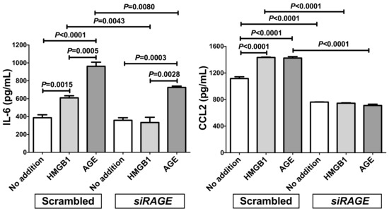 We also measured the concentrations of IL-6 and CCL2 in the RAGE-knocked-down SW872 cell culture medium via enzyme-linked immunosorbent assay (ELISA). The concentrations of IL-6 and CCL2 were significantly increased in response to HMGB1 and AGE in scrambled RNA-introduced cell culture medium. In contrast, the introduction of siRAGE significantly attenuated the HMGB1- and AGE-induced increases of IL-6 and CCL2 in the medium (Figure 5).