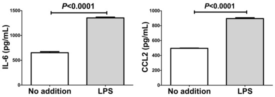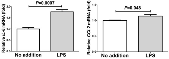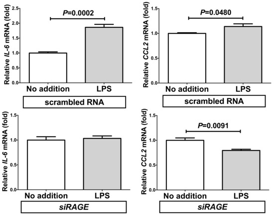 Recent reports indicated that PE/HDP is also induced by lipopolysaccharide (LPS) [32] and that RAGE mediates LPS signaling and acts as an LPS receptor [33,34,35,36,37,38]. Thus, we tested whether LPS up-regulate gene expression of IL-6 and CCL2 in human SW872 adipocytes. We added 10 ng/mL LPS in SW872 culture medium, incubated for 24 h, and the expression of IL-6 and CCL2 was analyzed via real-time RT-PCR. As shown in Figure 6, mRNAs of IL-6 and CCL2 were significantly up-regulated by the addition of LPS.