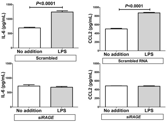 We also measured the concentrations of IL-6 and CCL2 in the RAGE-knocked-down SW872 cell culture medium via ELISA. The concentrations of IL-6 and CCL2 were significantly increased in response to the addition of LPS in scrambled RNA-introduced cell culture medium. In contrast, the introduction of siRAGE significantly attenuated the LPS-induced increases of IL-6 and CCL2 in the medium (Figure 9).