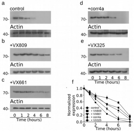 - Ren, H.Y.; Grove, D.E.; De La Rosa, O.; Houck, S.A.; Sopha, P.; Van Goor, F.; Hoffman, B.J.; Cyr, D.M. VX-809 corrects folding defects in cystic fibrosis transmembrane conductance regulator protein through action on membrane-spanning domain 1. Mol. Biol. Cell 2013, 24, 3016–3024. [Google Scholar] [CrossRef]