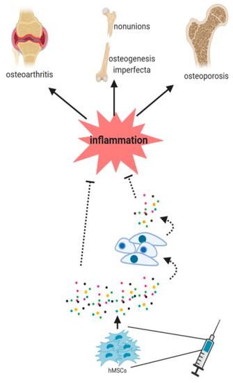 Currently, patients considered for MSCs treatments are typically refractory to all conventional therapies and/or suffer a low prevalence disease. Consequently, many of these clinical trials are performed with a small number of patients, making it difficult to reach statistically significant conclusions. There has been mounting evidence pointing towards the idea that the paracrine secretion of MSCs mainly orchestrates the beneficial effects observed in cell therapy. In fact, after facing the local environment, MSCs secrete a plethora of bioactive factors that affect the biology of host cells [52]. However, the molecular mechanisms responsible for these effects remain elusive. Thus, two scenarios (not mutually exclusive) are being considered to explain this effect: (1) The improvements of MSC therapy could be directly induced by their secreted factors, and/or (2) these factors could be the responsible for the activation/repression of different signaling pathways in the resident cell population which then stimulates host tissue regeneration (Figure 2). With respect to the immunomodulatory properties of MSCs, it should be noted that these depend on two factors: the inflammatory environment to which MSCs are exposed and the tissue of origin of MSCs. These observations imply that before expecting success with MSC therapies, a suitable inflammatory disease to be treated must be selected, as should an appropriate source of MSCs [87]. Regarding bone diseases, in this review, we have focused on bone defects someway connected to an inflammatory process which are currently treated or suitable to be treated with MSC therapies.