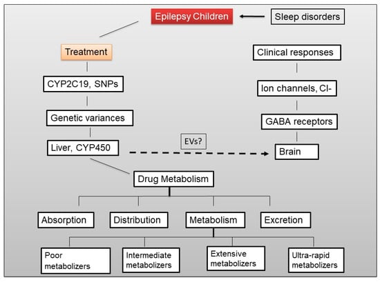 Sleep remains one of the least understood phenomena in biology, and sleep disturbances are one of the most common behavioral problems in childhood. The etiology of sleep disorders is complex and involves both genetic and environmental factors. Epilepsy is the most popular childhood neurological condition and is characterized by an enduring predisposition to generate epileptic seizures, and the neurobiological, cognitive, psychological, and social consequences of this condition. Sleep and epilepsy are interrelated, and the importance of sleep in epilepsy is less known. The state of sleep also influences whether a seizure will occur at a given time, and this differs considerably for various epilepsy syndromes. The development of epilepsy has been associated with single or multiple gene variants. The genetics of epilepsy is complex and disorders exhibit significant genetic heterogeneity and variability in the expressivity of seizures. Phenobarbital (PhB) is the most widely used antiepileptic drug. With its principal mechanism of action to prolong the opening time of the γ-aminobutyric acid (GABA)-A receptor-associated chloride channel, it enhances chloride anion influx into neurons, with subsequent hyperpolarization, thereby reducing excitability. Enzymes that metabolize pharmaceuticals including PhB are well known for having genetic polymorphisms that contribute to adverse drug–drug interactions. PhB metabolism is highly dependent upon the cytochrome P450 (CYP450) and genetic polymorphisms can lead to variability in active drug levels. The highly polymorphic CYP2C19 isozymes are responsible for metabolizing a large portion of routinely prescribed drugs and variants contribute significantly to adverse drug reactions and therapeutic failures. A limited number of CYP2C19 single nucleotide polymorphisms (SNPs) are involved in drug metabolism. Extracellular vesicles (EVs) are circular membrane fragments released from the endosomal compartment as exosomes are shed from the surfaces of the membranes of most cell types. Increasing evidence indicated that EVs play a pivotal role in cell-to-cell communication. Theses EVs may play an important role between sleep, epilepsy, and treatments. The discovery of exosomes provides potential strategies for the diagnosis and treatment of many diseases including neurocognitive deficit. The aim of this study is to better understand and provide further knowledge about the metabolism and interactions between phenobarbital and CYP2C19 polymorphisms in children with epilepsy, interplay between sleep, and EVs. Understanding this interplay between epilepsy and sleep is helpful in the optimal treatment of all patients with epileptic seizures. The use of genetics and extracellular vesicles as precision medicine for the diagnosis and treatment of children with sleep disorder will improve the prognosis and the quality of life in patients with epilepsy.
