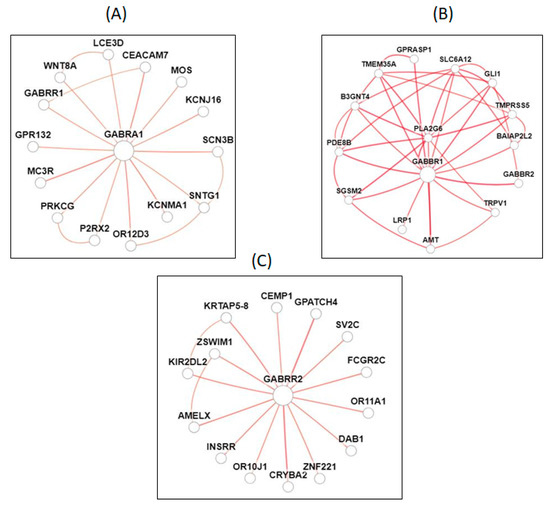 GABAA receptors are ligand gated, chloride selective ion channels formed from various combinations of proteins and subunit gene families. In cases where there is a dysfunction of these subunits, the ion channel gating expression and trafficking of the GABAA receptor to the cell surface can be affected [57]. The gene networks of GABAR1 and chloride transporter are shown in Figure 2A, and the genes that are involved in these networks include the following: potassium calcium-activated channel subfamily M alpha (KCNMA1), melanocortin 3 receptor (MC3R), carcinoembryonic antigen related cell adhesion molecule (CEACAM7), olfactory receptor family 12 subfamily D member 3 (OR12D3), sodium voltage-gated channel beta subunit 3 (SCN3B), protein kinase C gamma (PRKCG), potassium voltage-gated channel subfamily J member 16 (KCNJ16), MOS proto-oncogene, serine/threonine kinase (MOS), Wnt family member 8A (WNT8A), late cornified envelope 3D (LCE3D), gamma-aminobutyric acid type A receptor rho1 subunit (GABRR1), G protein-coupled receptor 132 (GPR132), purinergic receptor P2X 2 (P2RX2), syntrophin gamma 1 (SNTG1), and basal body orientation factor 1 (BBOF1).