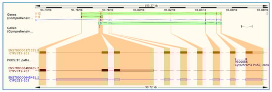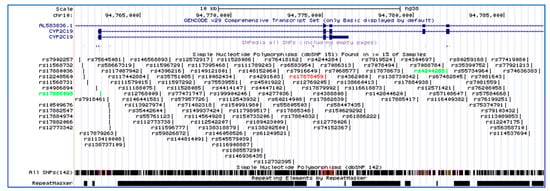 This network shows high interaction between CYP2C19 and other genes such as glutathione S-transferase mu 1 (GSTM1), glutathione S-transferase mu 2 (muscle), glutathione S-transferase mu 3 (brain), glutathione S-transferase theta 1 (GSTT1). The advantage of complete human genome project can lead to the identification of single nucleotide polymorphisms (SNPs) as the most common form of genetic variation [78,79]. SNPs comprise a large set of bi-allelic genomic variants that are found approximately every 100–300 bp throughout the genome, although less frequently in protein coding DNA sequences. Genetic polymorphisms of CYP450 enzymes mainly influence drug metabolism, disposition and elimination and lead to alteration of pharmacokinetic parameters resulting in changes in drug response as well as adverse drug reactions [80]. Next, we used genome at USSC to find out the CYP2C19 tagged SNPs (https://genome.ucsc.edu/cgi-bin/hgGateway). The tagged SNPs associated with the CYP2C19 gene are shown in Figure 5. A tagged SNP is a representative SNP in a region of the genome with high linkage disequilibrium that represents a group of SNPs called a haplotype.