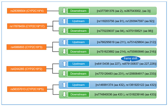 For CYP2C19 (rs4986893) is the defining polymorphism of the CYP2C19*3 allele and is a G > A transition in exon 4 that results in a premature termination codon at amino acid 212 [115]. The CYP2C19*3 allele frequencies in most populations is below 1%; however, it is more prevalent among Asians (2–9%) [83]. As shown in Figure 6, we identified the two up-and-down streams SNPs for each as well as their location on the genome (Figure 6).