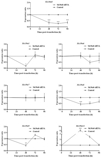 To explore the temporal ZIP response as cells adjust to ZnT8 deficiency, we knocked down Slc30a8 mRNA in MIN6 cells using siRNA and assayed expression of the Slc39a paralogues that we and others previously identified as important for β-cell function [28,29,30] at 48, 72 and 96 h (Figure 1). Slc30a8 showed >2-fold depletion at all three time-points. At 48 h, we observed upregulation of mRNA for Slc39a14 (8.56-fold), and downregulation for Slc39a1 (5.39-fold), Slc39a8 (2.20-fold) and Slc39a9 (2.22-fold). At both 72 and 96 h, only Slc39a8 remained differentially expressed compared to control cells (2.02-fold and 1.52-fold downregulation, respectively). These results show that ZnT8 expression affects the expression of ZIP transporters.