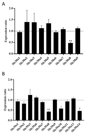 Total RNA was extracted from MIN6 cells using TRIzol Reagent (Thermo Fisher Scientific, Waltham, MA, USA), and treated with the high capacity RNA-to-cDNA kit (Thermo Fisher Scientific, Waltham, MA, USA). Primer Blast was used to predict whether primers bind to all SLC39A isoforms. PCR plates were loaded using the Biomek FX liquid handling robot (Beckman Coulter, Pasadena, CA, USA) and reactions (0–40 ng cDNA, 0.1 µM UPL probe, 0.2 µM forward primer, 0.2 µM reverse primer and 1X TaqMan Fast Advanced Mastermix (Applied Biosystems, Waltham, MA, USA)) amplified using the Prism7900HT sequence detection system (Applied Biosystems, Waltham, MA, USA) and analysed using sequence detection systems v2.4 software. Assay designs are provided in Table S1. Primer efficiencies ranged from 79 to 120%. The housekeeping gene ubiquitin C (UBC) was used as a control. Differential and relative expressions were calculated using the ΔΔCT method, and statistical significance was calculated using unpaired t-tests. Data shown are an average of three biological repeats.