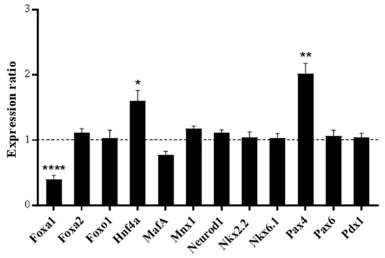 mRNA expression for transcription factors in ZnT8 haploinsufficient MIN6 cells. Expression of each gene was assayed through qPCR and is presented as a ratio compared to the expression level in sham-CRISPR MIN6 cells (control), as indicated by the dotted line. Experiments were carried out at 48 h. Data were analysed through t-tests and corrected for multiple comparisons. Error bars show ±SEM. n = 3. * p < 0.05, ** p < 0.005, **** p < 0.0001.
