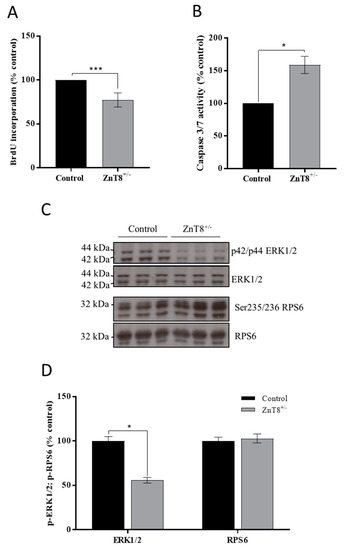 ZnT8 haploinsufficient MIN6 cells proliferate less (1.30-fold) compared with sham-CRISPR controls at 48 h. We additionally observed a 1.59-fold increase in apoptosis (Figure 5A,B). Mitogen-activated protein kinase (MAPK) cascades mediate proliferation through cell cycle regulation [36] and mechanistic target of rapamycin (mTOR) cascades promote proliferation through mediating mRNA translation [37]; both MAPK and mTOR pathways can be affected by zinc [38]. We therefore examined MAPK or mTOR signalling cascades by measuring phosphorylation of the downstream effectors ERK1/2 (Mapk1/3) and RPS6 (mTOR), which are both activated by phosphorylation. We observed decreased phosphorylation of ERK1/2 at p42/p44 compared to sham-CRISPR MIN6 cells (1.79-fold) but no effect on RPS6 (Figure 5C–D).