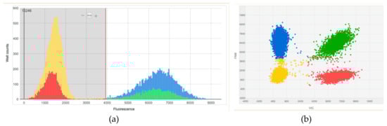 An example of a dPCR result histogram and scatterplot indicating the trisomy of chromosome 21 generated using QuantStudio 3D AnalysisSuite Cloud Software v3.1. (a) dPCR result histogram is generated by plotting an overview of the observed dye intensities (fluorescence) versus well count for every well on the chip. Red vertical line represents the fluorescence (call) threshold for chips calculated automatically in an Absolute Quantification project by the software. The yellow peak show unamplified wells (no target). The blue and red peak represents wells on the dPCR chip with target amplification (FAM and VIC reporter dye signal from each well). (b) The corresponding scatter plot showing signal from FAM reporter dye on the Y-axis against the signal from VIC reporter dye on the X-axis. All data points from every well on the dPCR chip are shown in the plot. The data points in the plot showing no signal (yellow), with only FAM reporter dye signal (blue), with only VIC reporter dye signal (red) and with both FAM and VIC reporter dye signal (green). In this study the following assays were used: probe on the chromosome 21 that generates a FAM-positive signal and probe on the reference chromosome 13, which generates a VIC-positive signal.