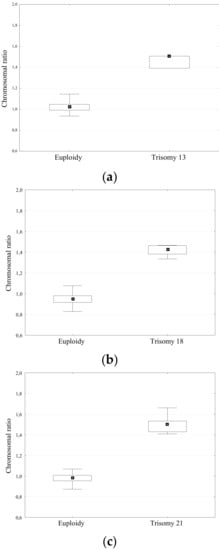 Box-and-whisker plots of the distribution of chromosome ratios in euploid and aneuploid samples. (a) Trisomy 13; (b) Trisomy 18 and (c) Trisomy 21. The boxes display the median (25th–75th percentiles) for the distribution; the whiskers represent the minimum and maximum value and the squares in the center of the plot represent the median.