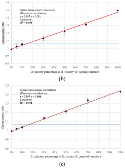 Scatter plots of serial dilutions for aneuploidies. Mixtures containing 0%, 5%, 10%, 30%, 50%, 70% and 100% of trisomies were performed. Scatter plots representing (a) slope ratios in 13 trisomy; (b) slope ratios in 18 trisomy and (c) slope ratios in 21 trisomy as a function of the percentage of the respective aneuploidies in the aneuploid/euploid mixture. Individual samples were analyzed in technical duplicates and averaged. The Pearson’s correlation was calculated. The red line represents an estimated linear fit (with a respective R2 value). The blue line marks a suggested cut-off point for aneuploidies detection (estimation based on Figure 3 on the basis of maximum values observed in euploid samples: 1.145 for T13, 1.068 for T21 and 1.077 for T18).