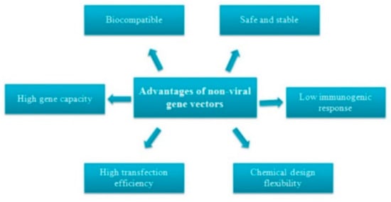 Recently viral vectors and non-viral vectors have been used as gene carriers for effective and safe gene delivery. Due to the intracellular gene delivery pathway, viral vectors have the advantage of high gene transfection. However, their use is limited due to side effects (Table 1). Therefore, non-viral vectors with advantages (Figure 1), such as low immunogenic response, safety, high gene capacity, and stability and chemical design flexibility, have received increasing attention. Furthermore, it is practically easy to create and chemically alter non-viral vectors on a large scale. Most importantly, the non-viral vector system is not restricted by the molecular size of the gene to be introduced [6,7,8].