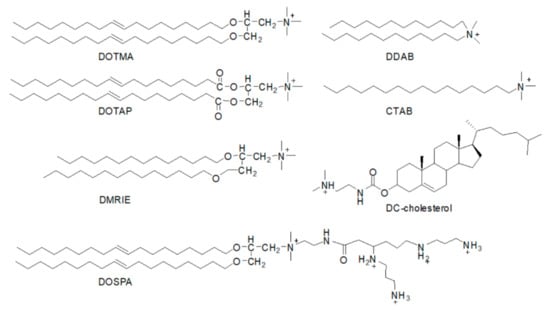 Lipids are a diverse set of compounds with the defining feature of insolubility in water. Biological membranes contain phospholipids and sterols as major structural elements. This fact has been utilized in the preparation of non-viral vectors as gene carries to facilitate an easy delivery [13]. Since the first cationic lipid DOTMA was prepared in 1987, a lot of similar cationic lipids, such as DOTAP, DDAB, and CTAB, have been prepared and applied in gene delivery in different cell types (Figure 2) [33,34,35,36].