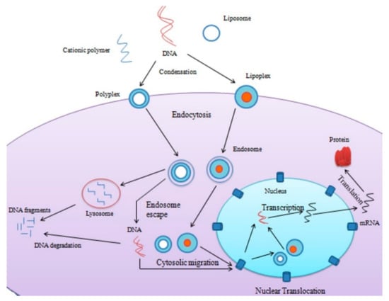 Basic mechanism of non-viral gene delivery via polyplex and lipoplex.