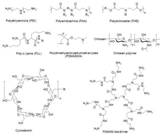 Cationic polymers can be of natural or synthetic origin. Examples of natural cationic polymers include chitosan, cationic dextran, gelatin, cationic cellulose, and cationic cyclodextrin, whereas examples of synthetic polymers include dendrimers [1,3,10], polyethylenimine (PEI) [12], polyamidoamine (PAA), polyaminoester (PAE), Poly(ethylene oxide) and polylysine [44], and poly dimethylaminoethylmethacrylate (PDMAEMA), etc. [15]. (Figure 4).