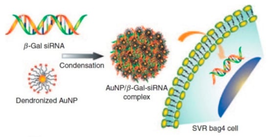 Schematic illustration of G2-AuNP/β-gal-siRNA complexation and transfection into SVR-bag4 cells [32].