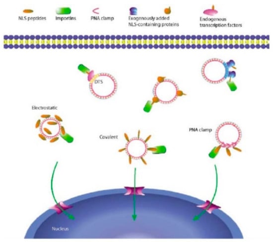 During the gene transfer process, many cells that are of target interest do not actively undergo cell division. Therefore, nuclear transport in the non-dividing cells is of significant importance. One of the methods proposed to enhance the nuclear import relies on the linking of NLS-peptides or NLS-containing proteins by either electrostatic, covalent, or PNA clamps to the DNA (Figure 6) [64].